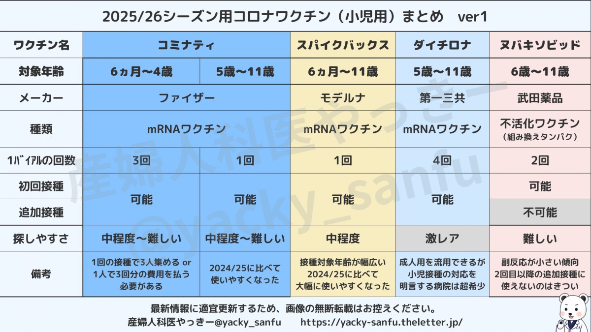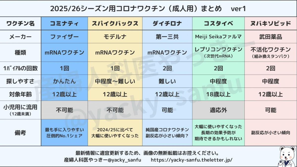 というわけで今日は、2025/26シーズン用として流通している5種のコロナワクチンの違いについて余計な情報をなるべく省いてまとめてみましょう🐻❄️