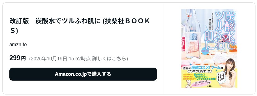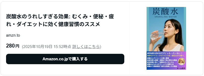 Amazonで検索して出てきた書籍を総合すると、炭酸水を飲むだけでツルふわ肌が得られ、自律神経が整い、むくみ・便秘・疲労がとれてダイエットにも効果的だそうです。万能薬かな?